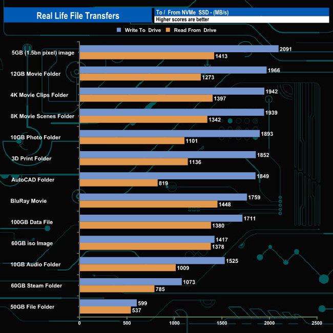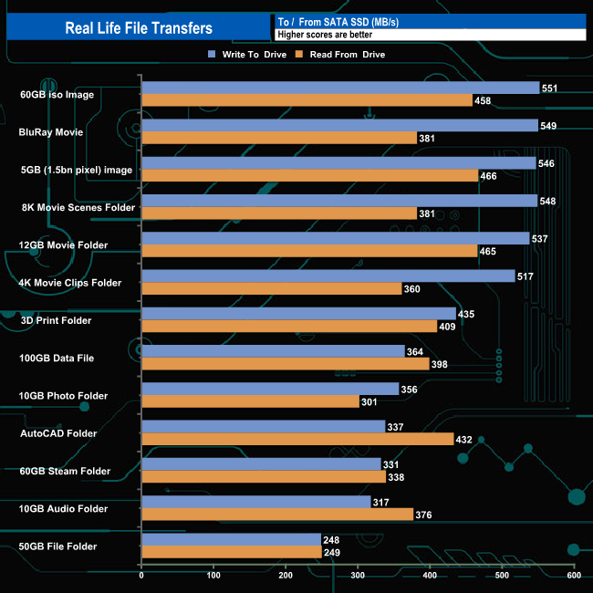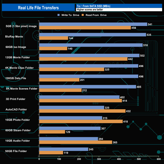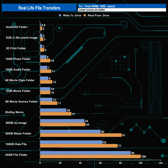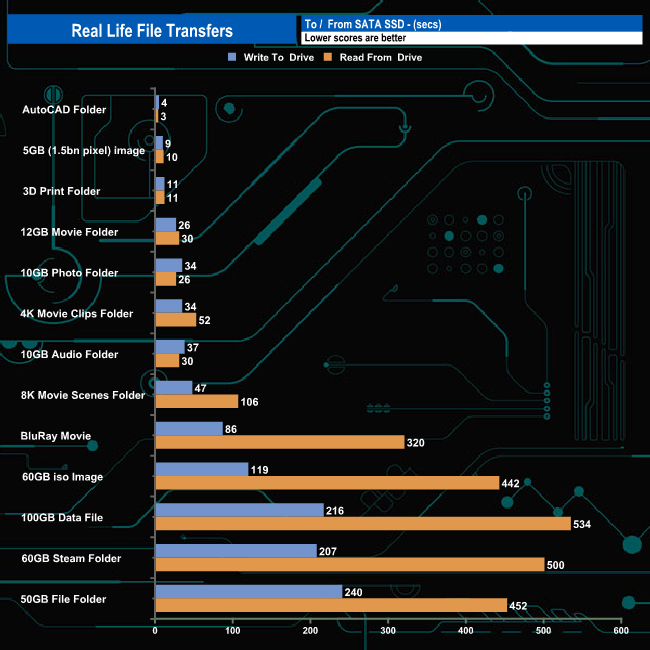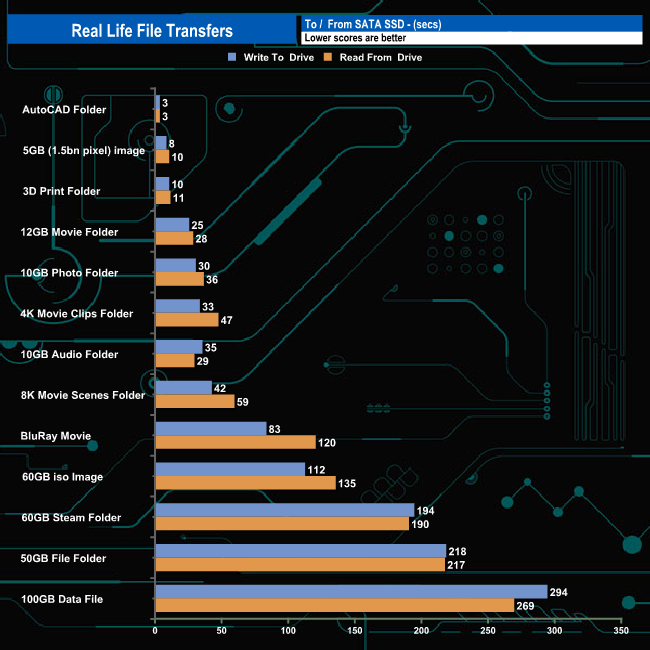 To test the real-life performance of a drive we use a mix of folder/file types and by using the FastCopy utility (which gives a time as well as MB/s result) we record the performance of the drive reading from & writing to a 256GB Samsung SSD850 PRO.