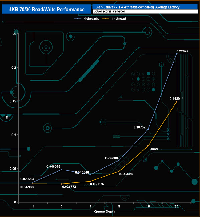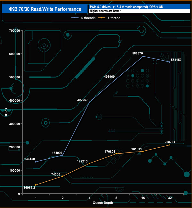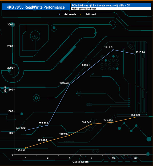 We used CrystalDiskMark 8’s custom settings to test the 4K 70/30 mixed read/write performance of the drive through a range of queue depths using a single thread and four threads.