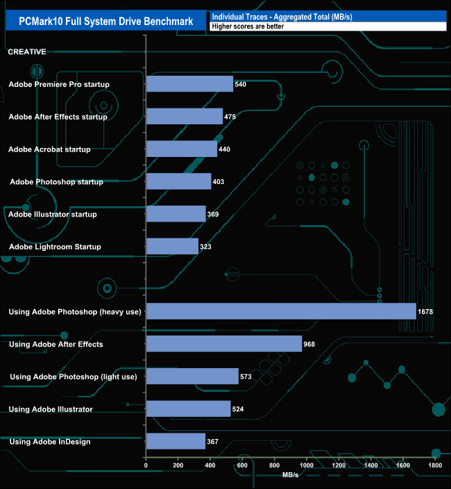Switching over to the Adobe usage traces, the drive averaged 822MB/s, which includes the 1,678MB/s result for the Adobe Photoshop heavy usage trace. The slowest of the five traces was the InDesign trace at 367MB/s.