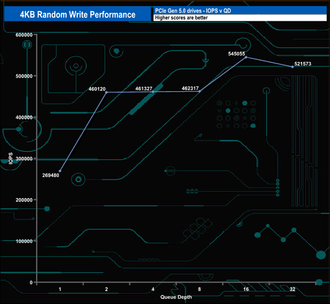 As with the 4K random read tests, the random write test results are well short of the official 2.4M IOPS, peaking at 545,055 IOPS (QD16) before dropping back to finish the test run at 521,573 IOPS.