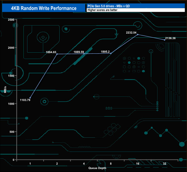 We used CrystalDiskMark 8‘s custom settings to test the 4K random write performance of the drive through a range of queue depths. The setup for the tests is listed below.