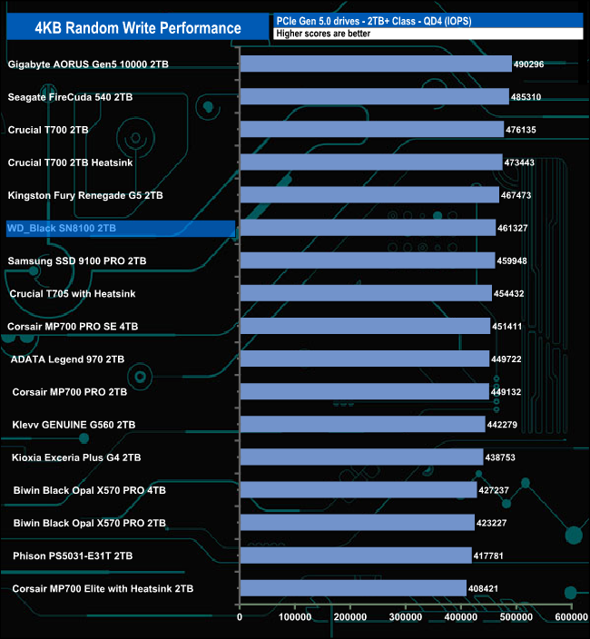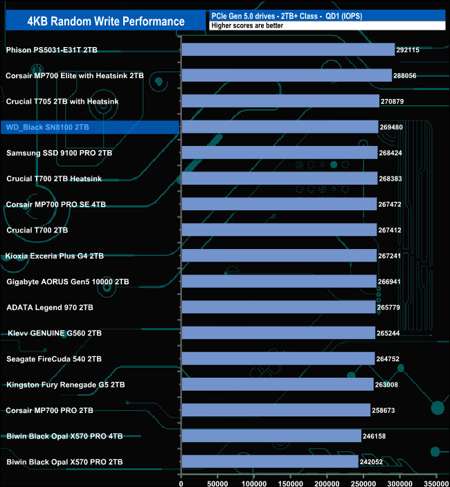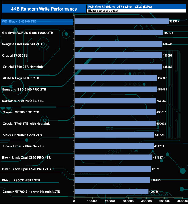 At QD1, the 2TB WD_Black SN8100 sits in fourth place on the results table. At QDs 2 and 4, the drive has slipped to sixth place. But by QD32, it has moved up to the top spot with a test result of 521,573 IOPS.