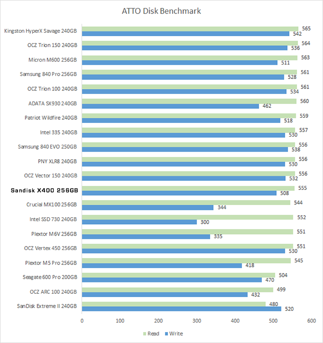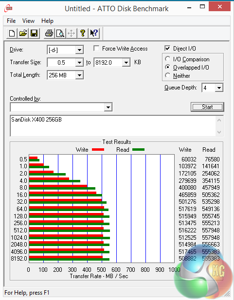 When it comes to ATTO’s sequential tests the 256GB X400 manages to surpass the official read figure of 540MB/s at 555MB/s. It doesn’t quite manage the same feat when it comes to writes at 508MB/s.
