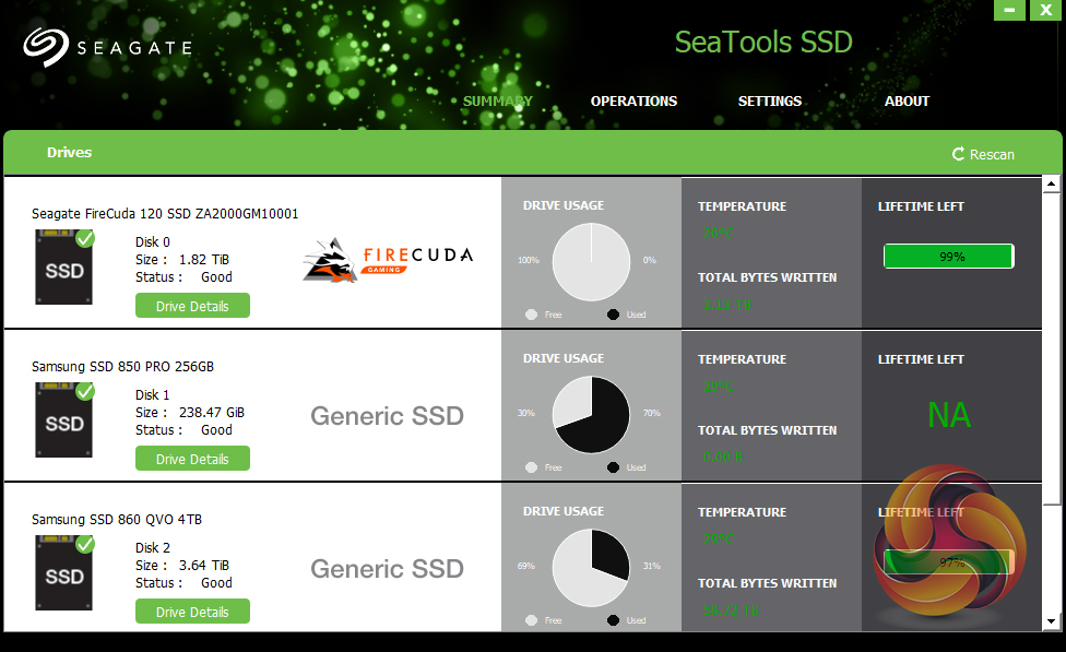 Seagate’s management software for the FireCuda is the SSD version of their SeaTools software. SeaTools SSD displays the drive’s health and supports firmware upgrading and secure erase. Although SeaTools SSD doesn’t come with any drive cloning utility built-in per se it does provide a link to download Seagate’s DiscWizard cloning software.