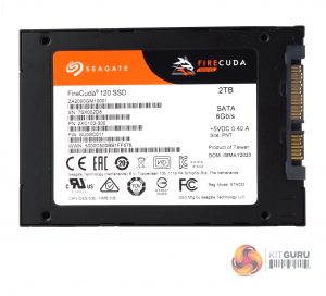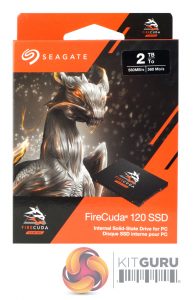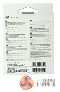 Seagate’s FireCuda 120 comes in a striking orange and white box with Seagate’s FireCuda dragon mascot prominently displayed along with a small image of the drive. At the top of the box is a sticker which displays the drive’s capacity and the Sequential read speed of the drive. The rear of the box is covered by multilingual bullet points about the Sequential Read/Write speeds and the drive's endurance.
