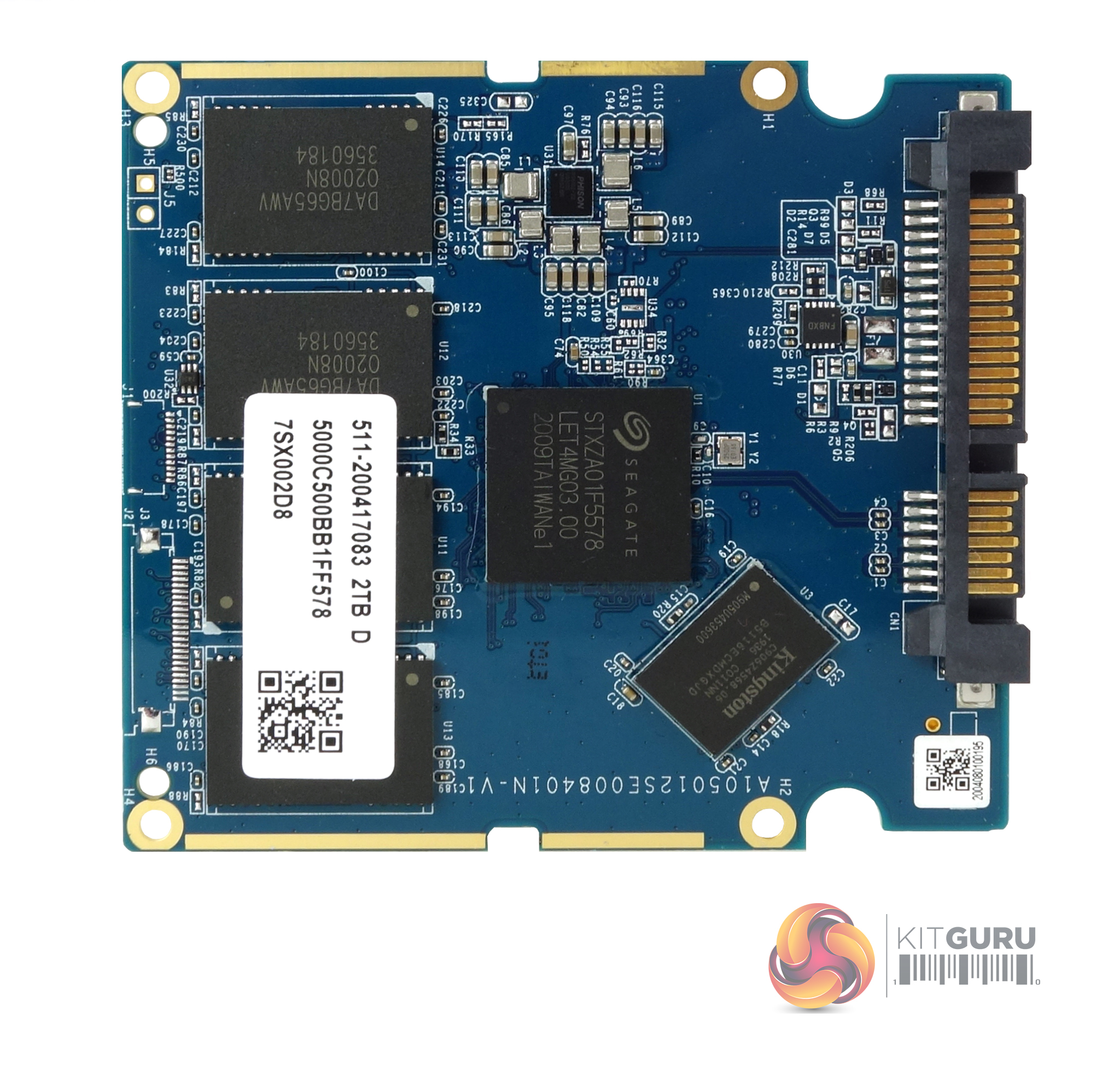 One side of the PCB houses the controller, branded Seagate STXZA01F5578. Although branded Seagate, it's actually a re-branded Phison PS3112-S12 IC. The 8-channel controller supports 3D MLC/TLC and QLC NAND technologies and features LDPC, SmartECC and end to end data protection. Along with the controller are four 96-layer BiCS4 3D TLC packages (branded DA7BG65AWV) and a DRAM chip for cache duties. The other side of the PCB holds another DRAM chip and four more NAND packages.