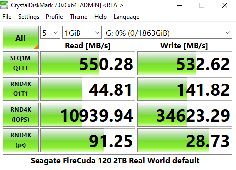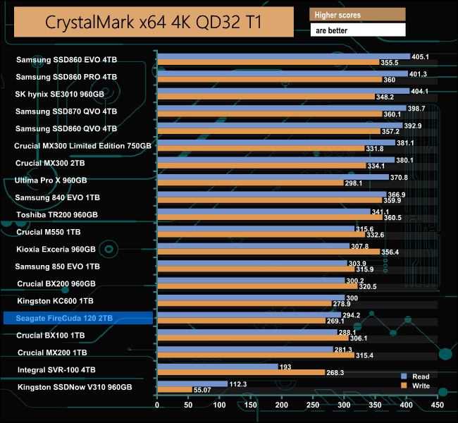 The Seagate FireCuda 120 doesn't seem to handle CrystalDiskMark's deeper queue depth test too well as sits in the bottom third of our results chart.
