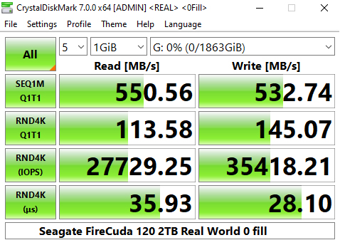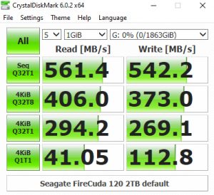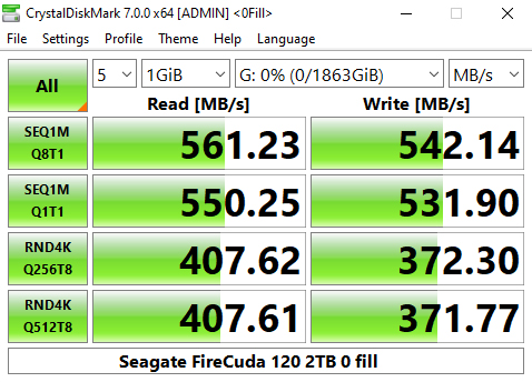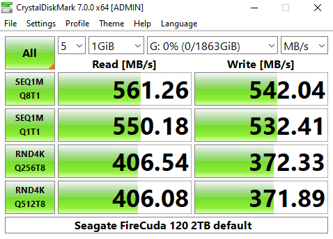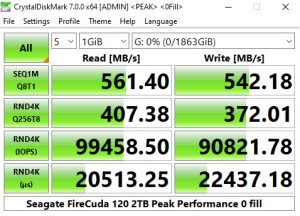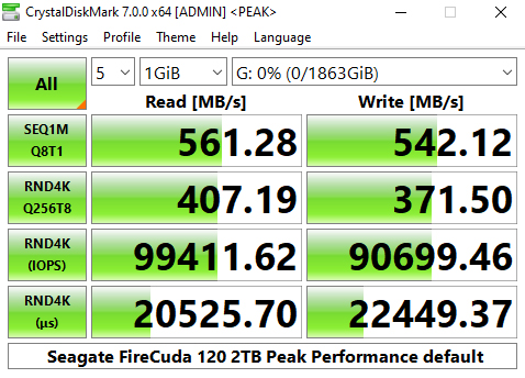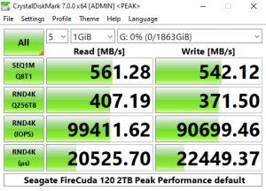Looking at the Peak Performance results for Sequential read/write performance we could confirm both official Sequential performance figures. The drive is rated up to 560MB/s for reads and up to 540MB/s for writes. Under testing the 2TB FireCuda 120 produced read/write figures of 561MB/s and 542MB/s respectively.