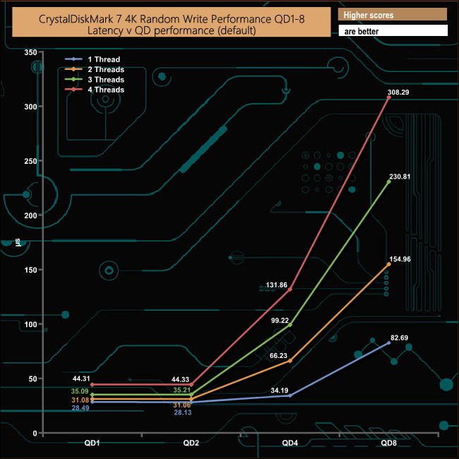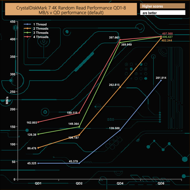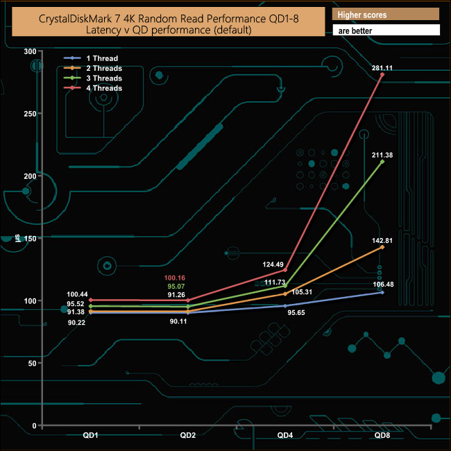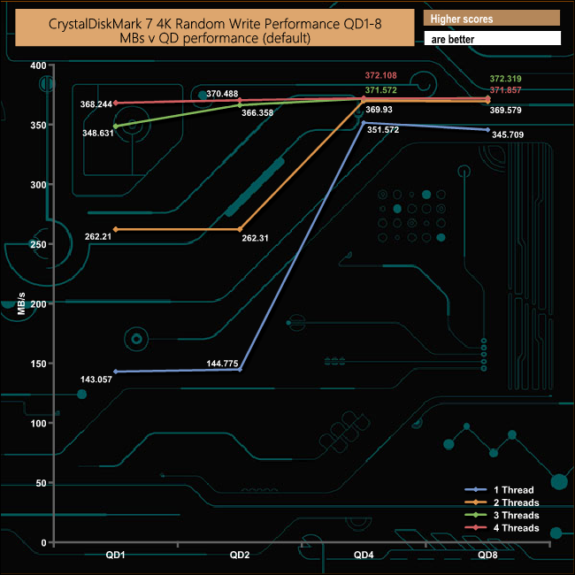 We also used CrystalDiskMark 7 to test the random performance of the drive at lower queue depths (QD1 – QD8 where most of the everyday workloads occur) using 1 to 4 threads.
