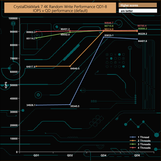 In the write tests, the most dramatic leap in performance was with a single thread from QD1 (34,926 IOPS) to QD4 (85,833), after which the performance tailed off slightly.