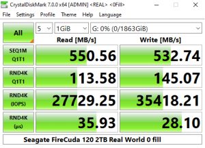 The latest version of CrystalDiskMark, version 7, includes a couple of profiles that can be used for testing – Peak Performance and Real World. The result screens for these two profiles not only display MB/s results but also IOPS and latency.