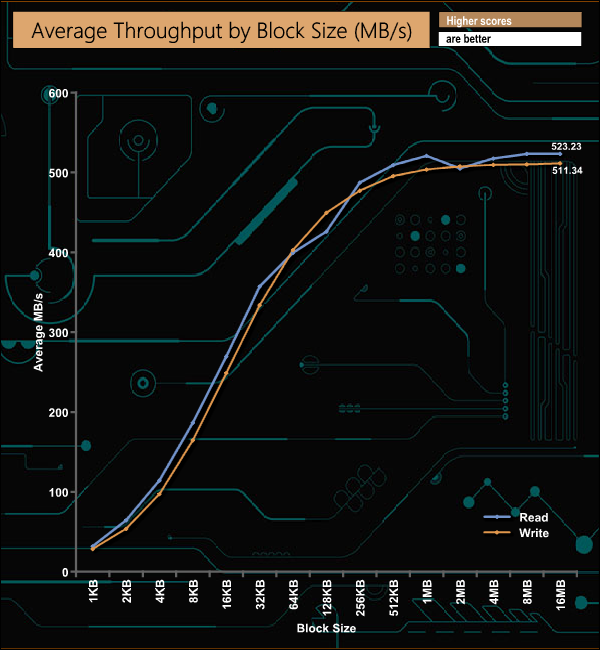In our throughput tests the drive peaked at 523.25MB/s for reads and 511.34MB/s for writes, both figures a little shy of the official 560MB/s read and 540MB/s write maximums of the drive.