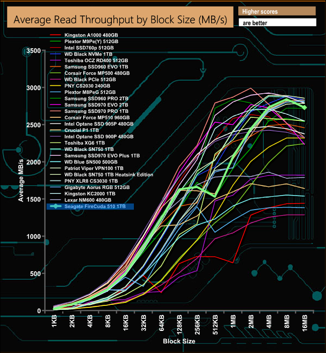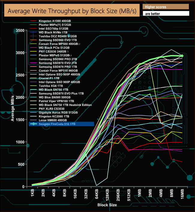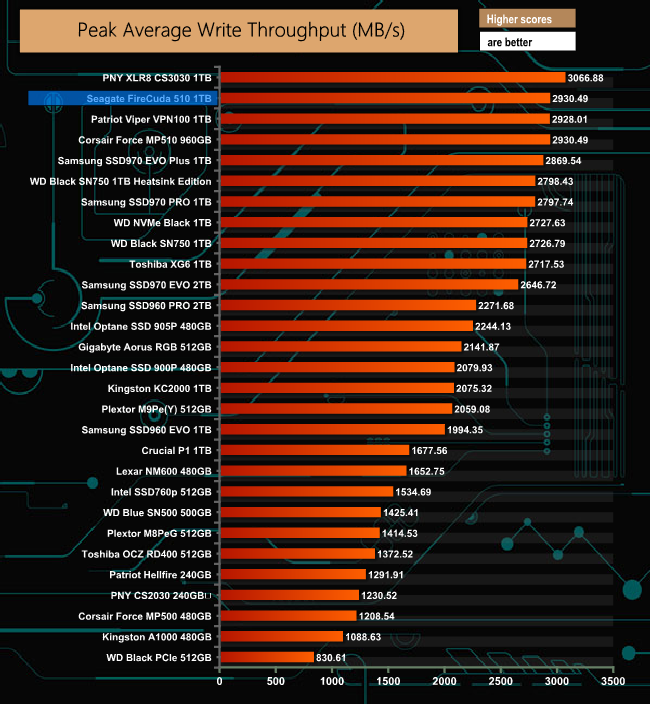 Peak average write score for the FireCuda 510 in our throughput test, 2,930.49MB/s, came at the 8MB block mark.