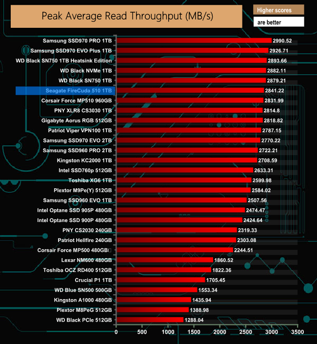 The read figure of 2,841.22MB/s puts the FireCuda 510 into fifth position in our results chart.