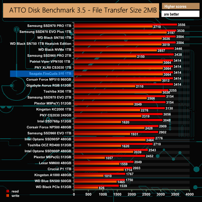 The official maximum Sequential read/write figures for Seagate's FireCuda 1TB drive are up to 3,450MB/s and 3,200MB/s respectively. When our review sample was tested with the ATTO benchmark it couldn't quite match those official maximums at 3,414MB/s for reads and 3,064MB/s for writes.