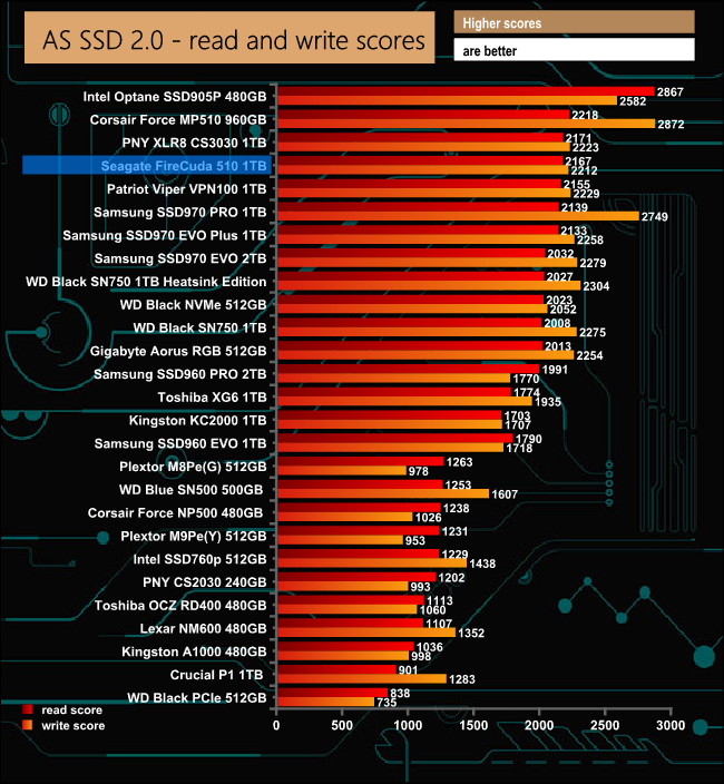 The FireCuda 1TB drive displays strong performance in the AS SSD benchmark with its 2167 read and 2212 write scores. It joins its fellow 1TB class Phison PS5012-E12 / Toshiba 64-layer BiCS3 3D TLC NAND users, the Corsair Force MP510, PNY XLR8 CS3030 and Patriot's Viper VPN100 towards the top of the results table.