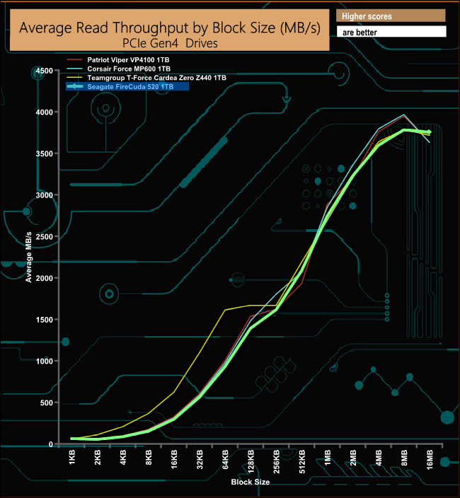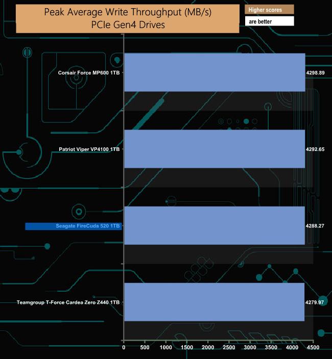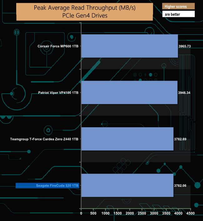 In our read throughput test, the Seagate FireCuda 520 performance peaked at 3,782.06MB/s, at the 8MB block mark.