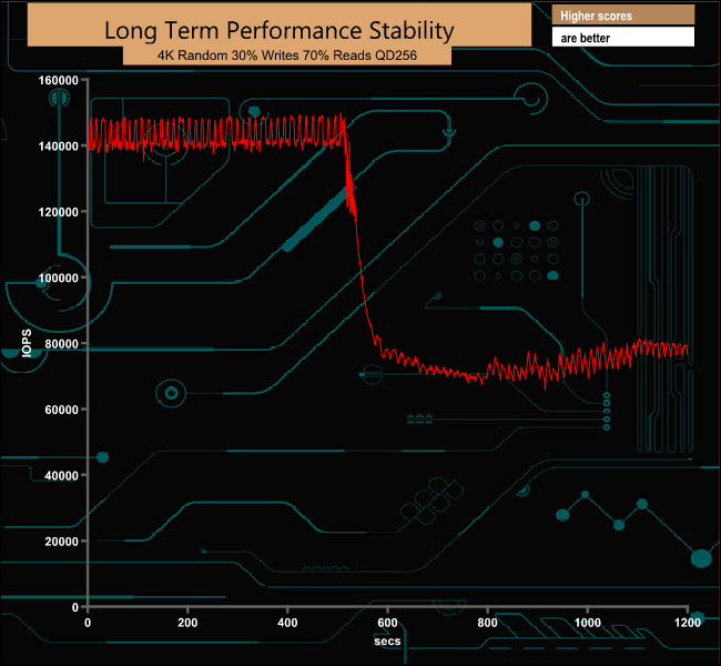 For the long term performance stability test, we set the drive up to run a 20-minute 4K random test with a 30% write, 70% read split, at a Queue Depth of 256 over the entire disk. The 1TB Seagate FireCuda 520 averaged 105,363 IOPS for the test run with a performance stability of 71%.
