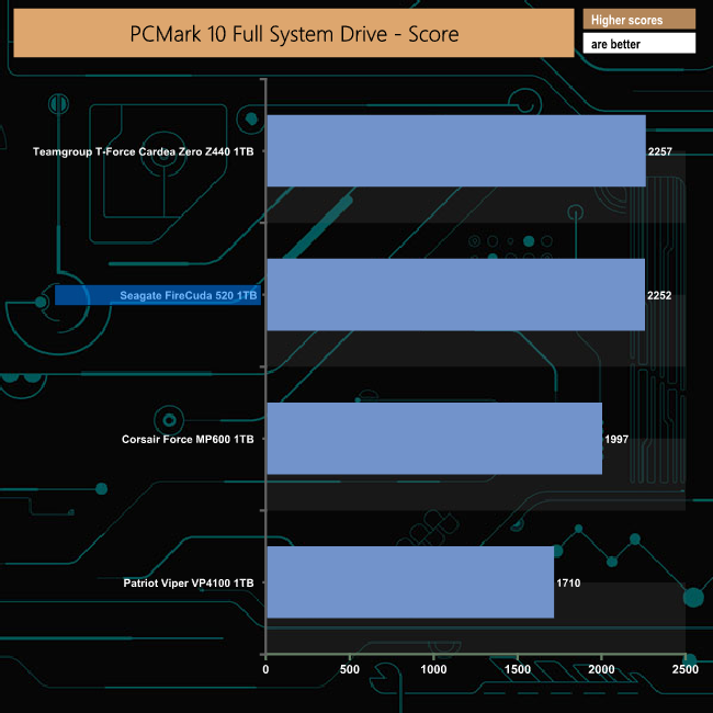 Seagate's FireCuda handles the PCMark 10 Full System Drive Benchmark very well producing the second-best overall score and third-best bandwidth figure of 362.77MB/s.