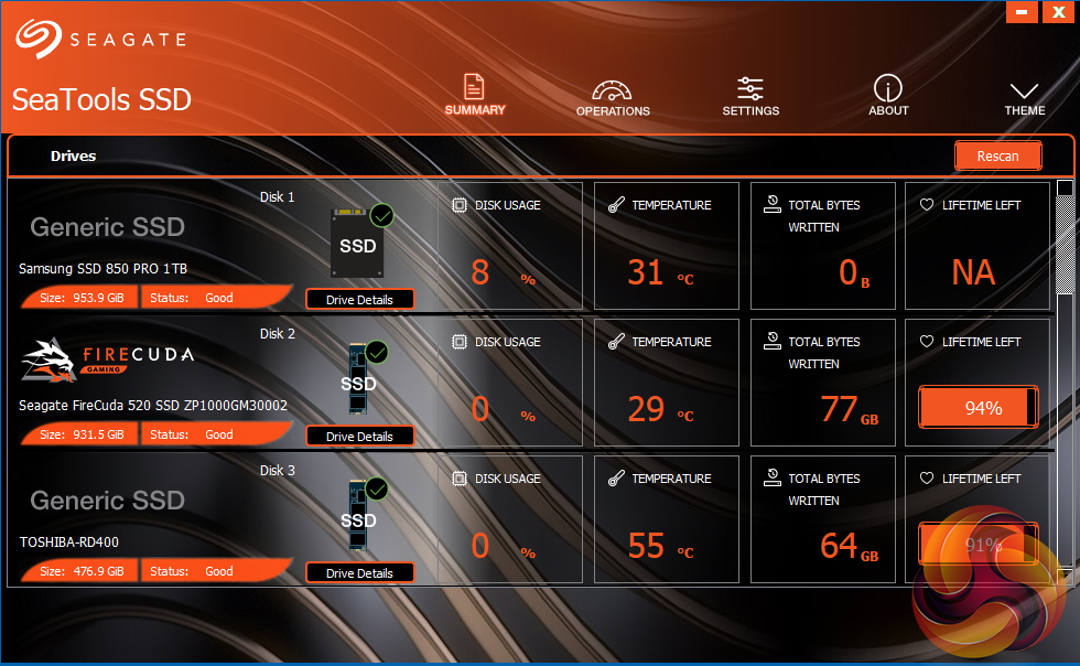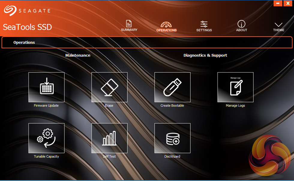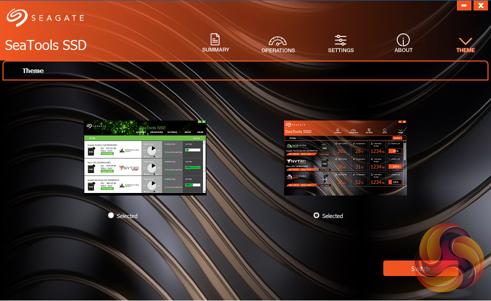 Seagate's management software for the FireCuda is the SSD version of their SeaTools software. SeaTools SSD displays the drive's health and supports firmware upgrading and secure erase. It even gives you a choice of two themes. Although SeaTools SSD doesn't come with any drive cloning utility built-in per se it does provide a link to download Seagate's DiscWizard cloning software.