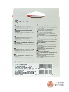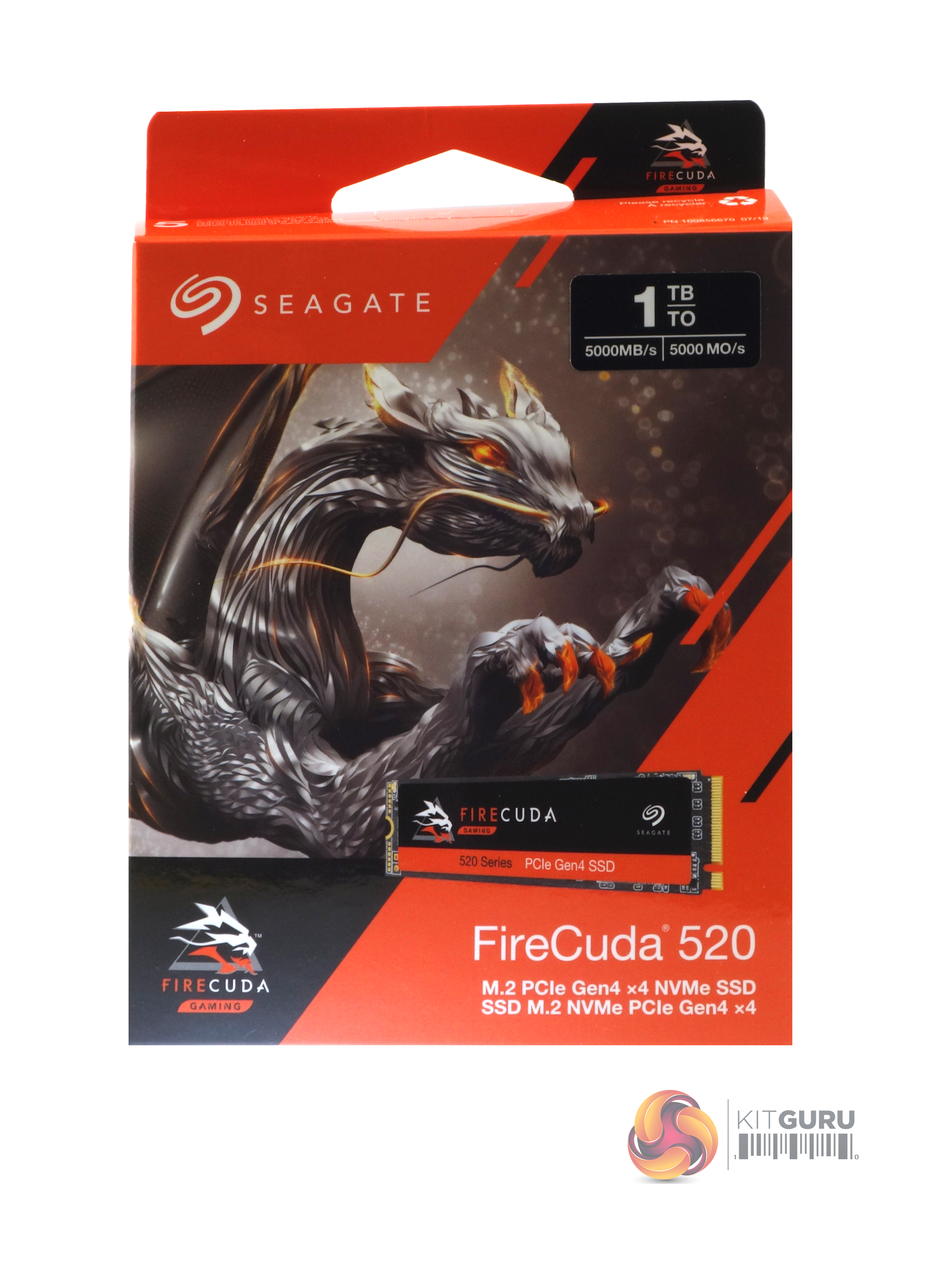 Seagate's FireCuda 520 comes in a striking orange and white box with Seagate’s FireCuda dragon mascot prominently displayed along with a small image of the drive. At the top of the box is a sticker which displays the drive's capacity and the Sequential read speed of the drive. Towards the bottom of the box is some text displaying the interface of the drive.