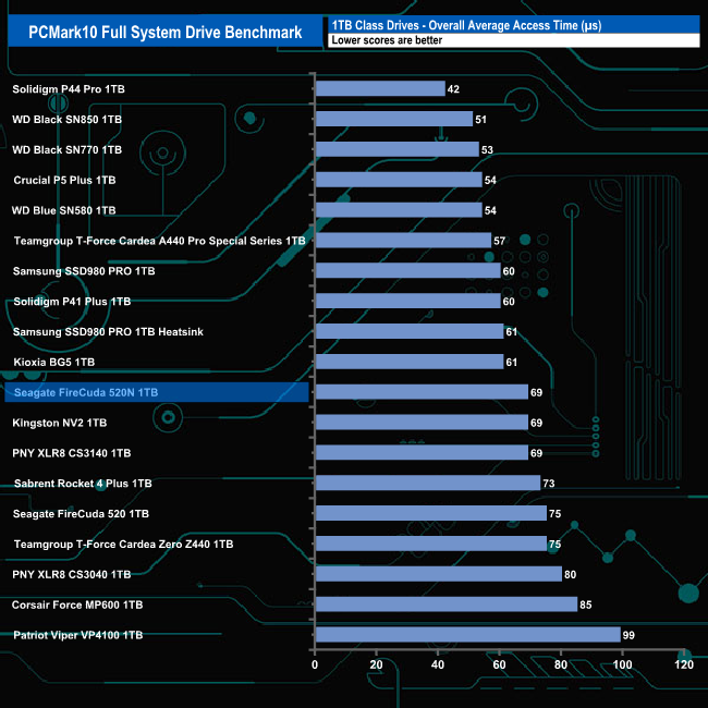 Seagate's FireCuda 520N handles the stress of PCMark10's Full System Drive Benchmark pretty well. It averaged 190MB/s for the six Adobe startup traces, the fastest being the 225MB/s for the startup test trace of Adobe Acrobat followed very closely by the Premiere Pro trace at 224MB/s. For the Adobe usage traces it averaged 394MB/s for the five tests, with the fastest being the 894MB/s for the Adobe Photoshop heavy usage trace.