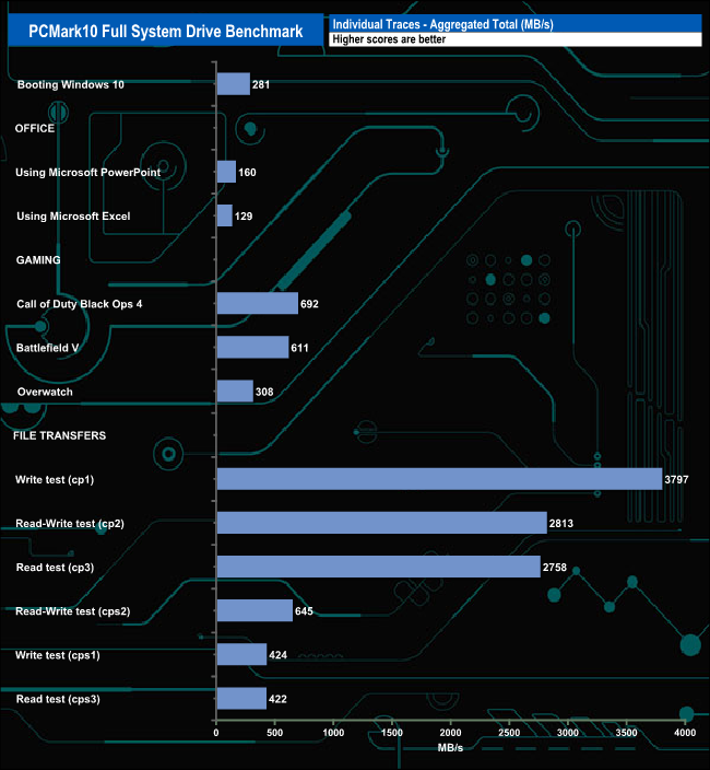 The drive averaged 536MB/s for the three gaming test traces, the fastest being Call Of Duty Black Ops 4 at 692MB/s, followed by Battlefield V at 611MB/s and finally Overwatch at 308MB/s. When it came to the file transfer traces, the drive averaged 1,476MB/s for the six tests with the fastest being the cp1 write test at 3,797MB/s.
