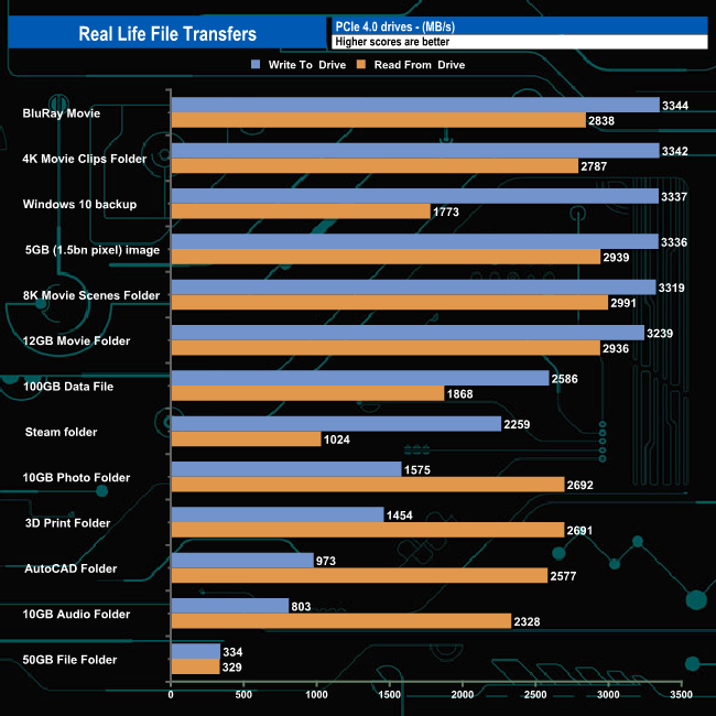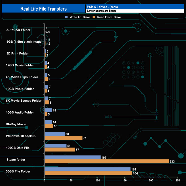 When it came to our real-life file transfer tests, the 1TB Seagate FireCuda 520N averaged 2,300MB/s when writing the 13 transfer tests with an average time of 30.8 seconds. The fastest transfer bandwidth was the Blu-ray movie folder at 3,344MB/s (14 secs) while the slowest was the 334MB/s (141 secs) for the 50GB file folder. Reading the data back the drive averaged 2,290MB/s with an average time of 44 seconds. This time the fastest transfer was the 8K Movie Scene folder at 2,991MB/s (8 secs). Once again it was the 50GB file folder transfer that was the slowest at 329MBs (164 secs).