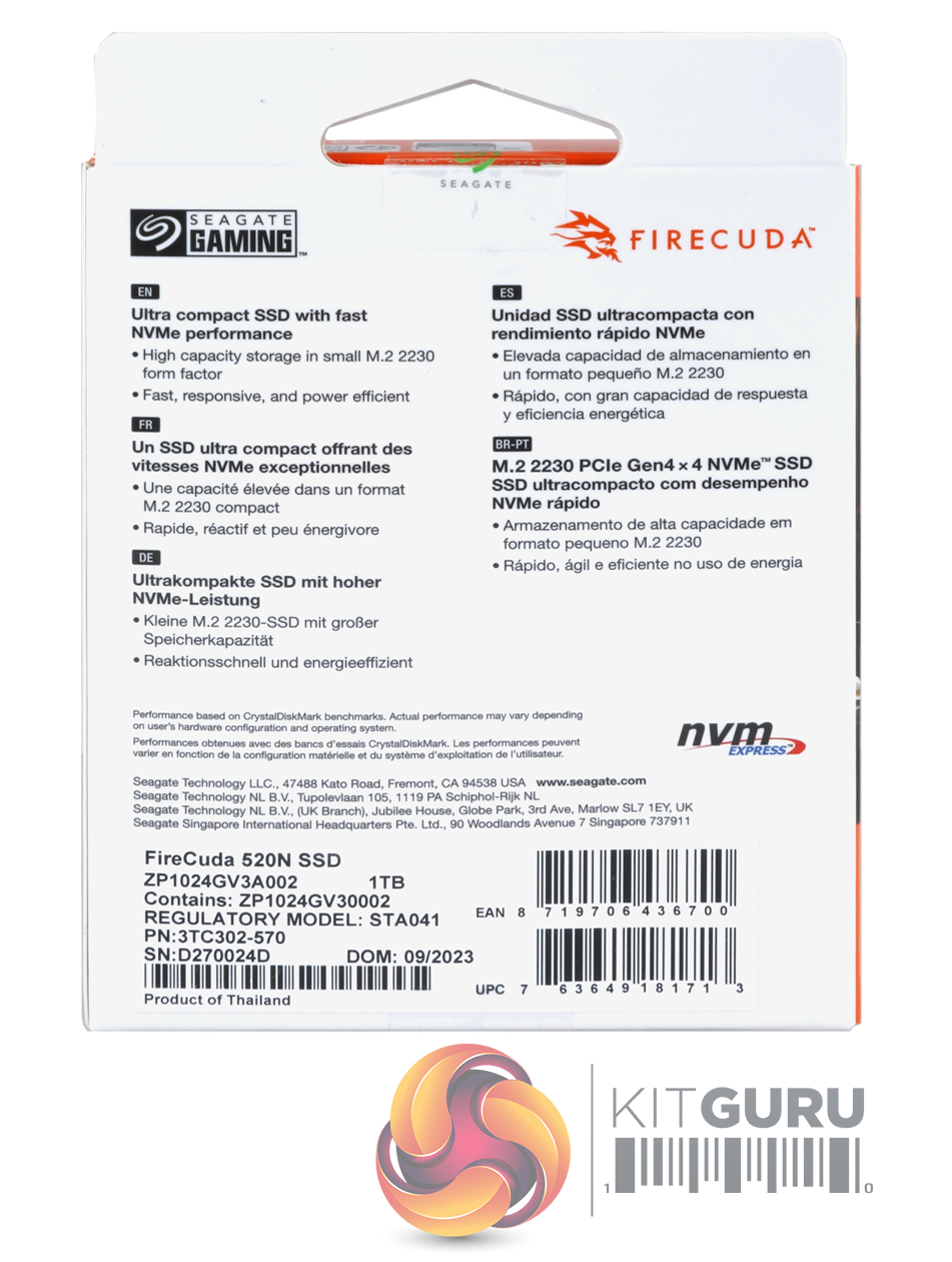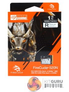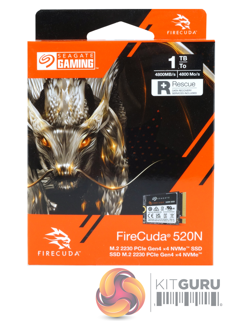 Seagate’s FireCuda 520N comes in a striking orange and white box with Seagate’s FireCuda dragon mascot prominently displayed along with a small image of the drive. At the top of the box is a sticker that displays the drive’s capacity, Sequential read speed and the fact that the drive is backed with three years of the company's Rescue Data Recovery Service. Towards the bottom of the box is some text displaying the interface of the drive.