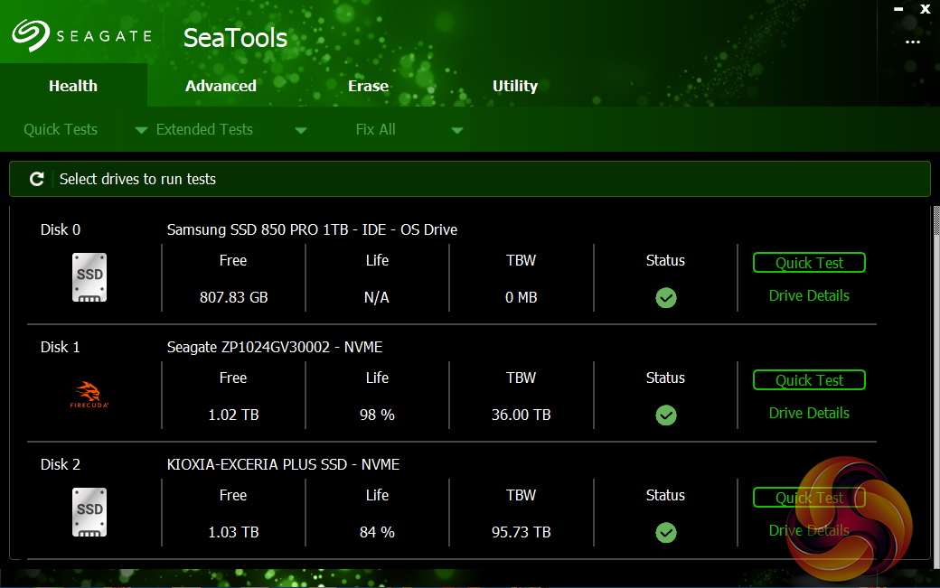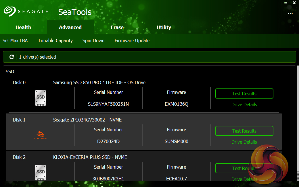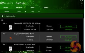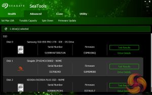 Seagate’s management software for the FireCuda is the SSD version of their SeaTools software. SeaTools SSD displays the drive’s health and supports firmware upgrading and secure erase. At first glance, it doesn't seem to be as feature-rich as some of its competitors but the devil is in the detail. Using a tab-based menu it has four main sections; Health, Advanced, Erase and Utility.