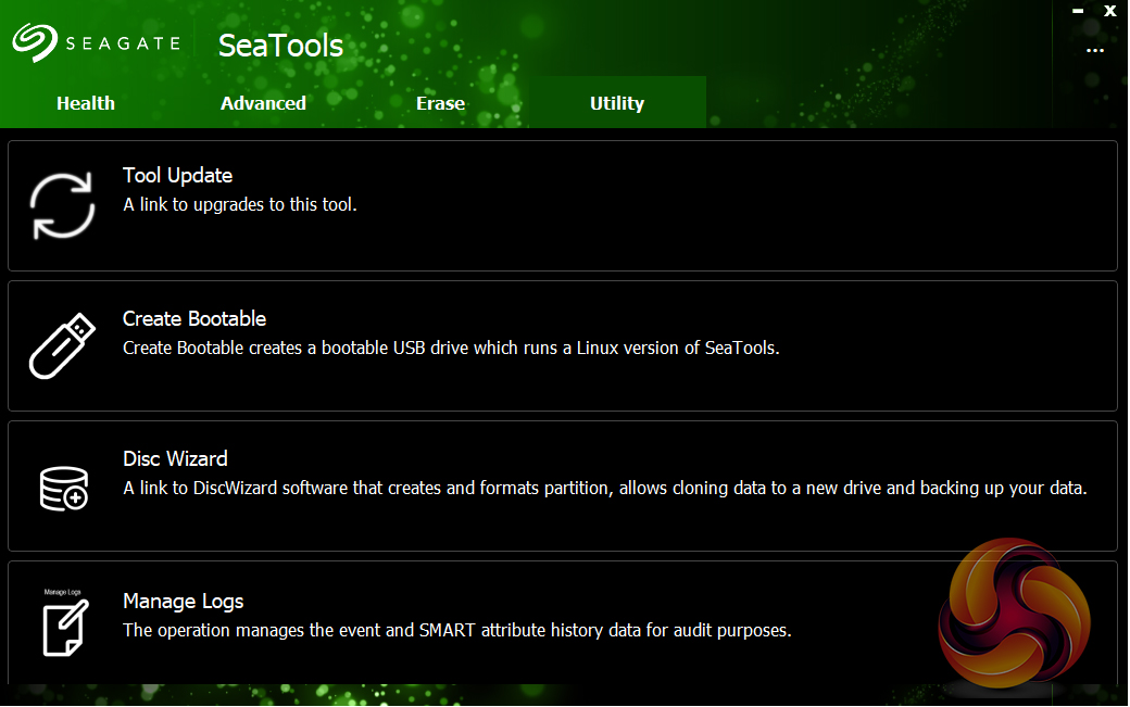 Under the Utility tab, you can update SeaTools, create a bootable USB drive and manage event and SMART logs. There's also a link to download Seagate's DiskWizard partition building and cloning software.