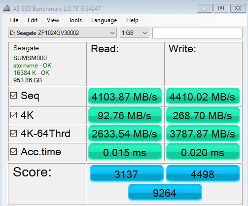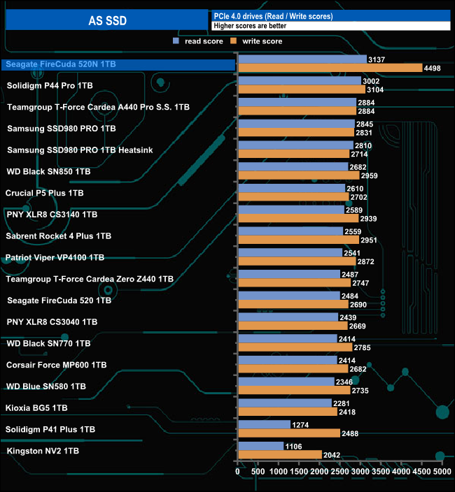The read score of 3137 in the AS-SSD benchmark is good enough to put the drive on top of the 1TB class Gen 4 drive results chart. But even more impressive was its write score of 4498.