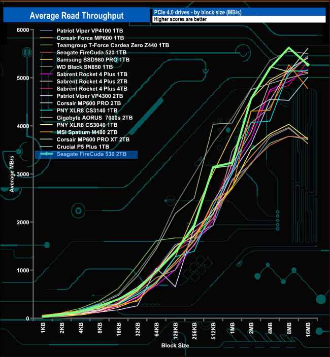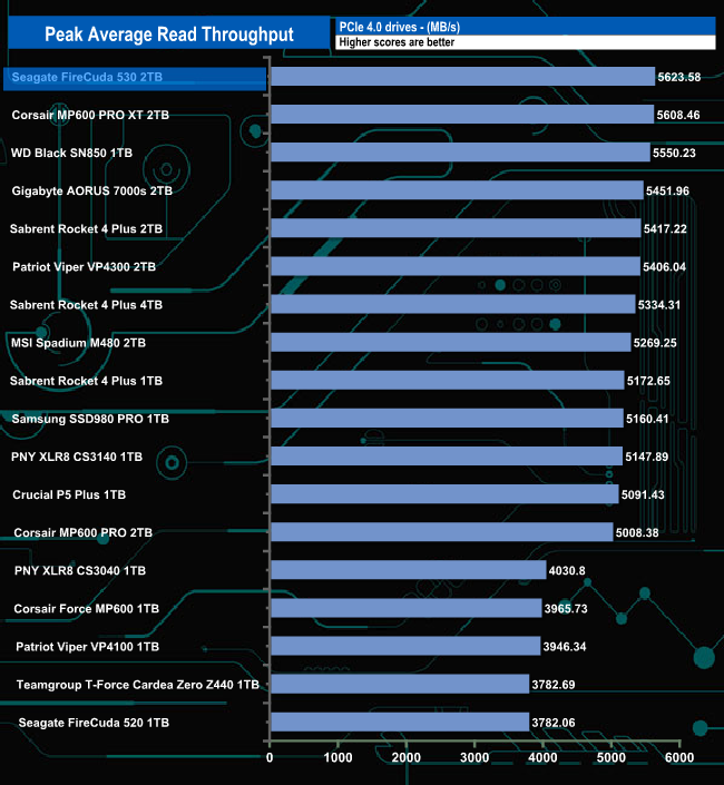 Although the test result of 5,623.58MB/s is well short of the official maximum for the drive, it's good enough to plant the FireCuda 530 on top of our results chart. This is in marked contrast to the previous generation FireCuda 520 which sits in the last position in the chart.