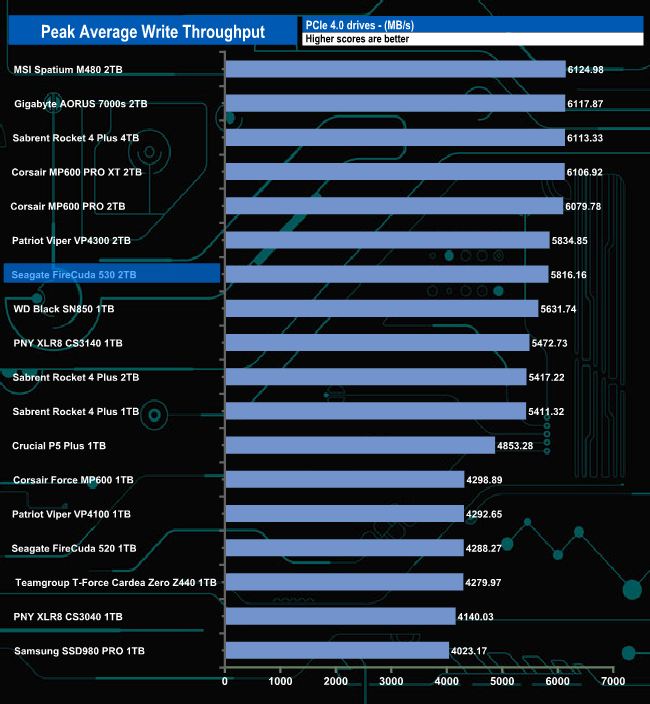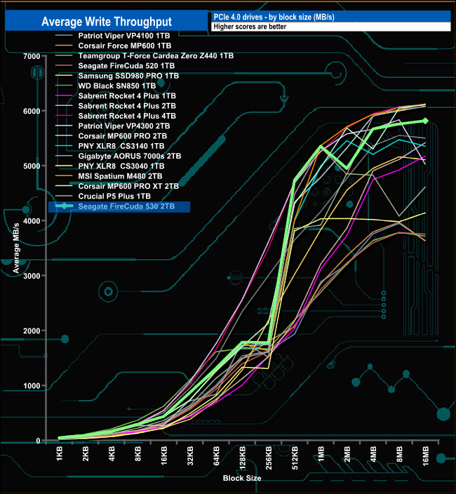 In our write throughput test, the FireCuda 530 peaked at 5,816.156MB/s (16MB block), some way short of the official maximum of 6,900MB/s. Unlike the read result, this is only good enough to put the drive into seventh place on our list.