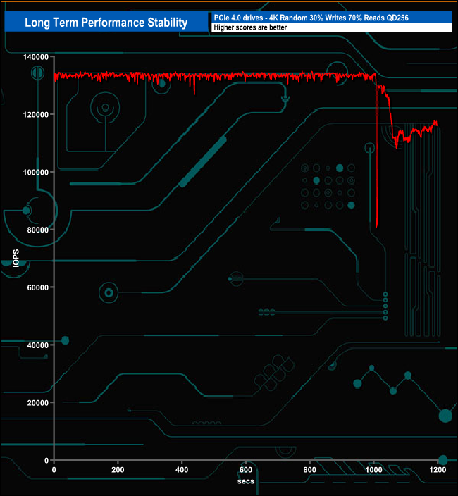 For the long term performance stability test, we set the drive up to run a 20-minute 4K random test with a 30% write, 70% read split, at a Queue Depth of 256 over the entire disk. The Seagate FireCuda 530 averaged 130,598 IOPS for the test with an enterprise segment worthy performance stability of 97%.