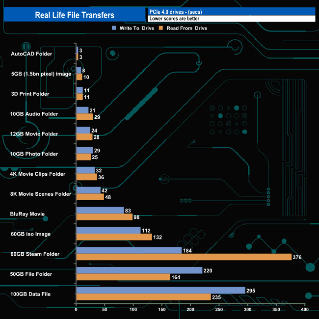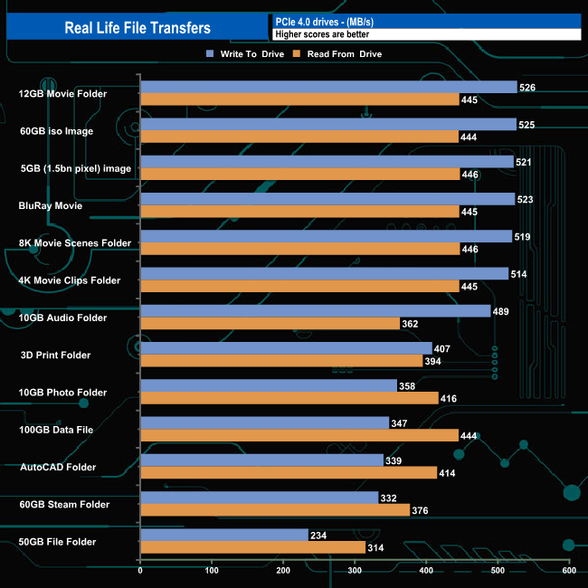 The Seagate FireCuda 530 handled our real-life file testing without displaying any real problems averaging 521MB/s writing the larger test files to the drive and 445MB/s when reading the data back again. The two slowest transfers were the 60GB Steam Folder (332MB/s write, 376MB/s read) and the 50GB file folder (234MB/s write, 314MB/s read).