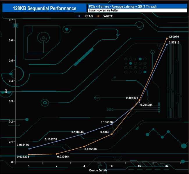 We used CrystalDiskMark 8‘s custom settings to test the Sequential read and write performance of the drive through a range of queue depths. The setup for the tests is listed below.