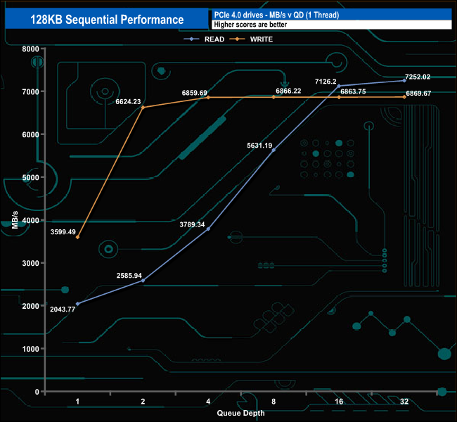 The best Sequential read figure we saw in this test of 7,252.02MB/s is a little short of the official maximum of 7,300MB/s. The best write test figure of 6,869.67MB/s is closer to the official best of 6,900MB/s.