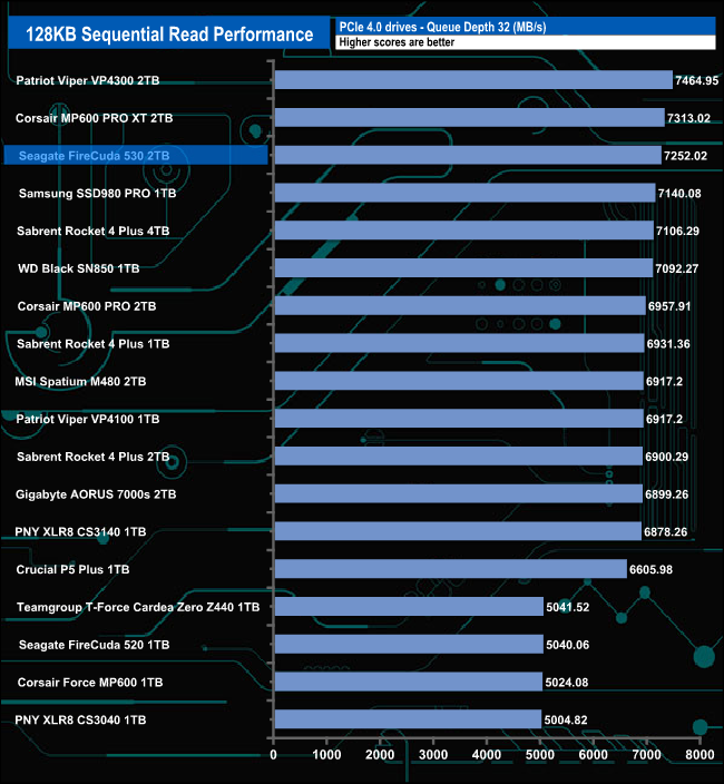 At QD1, the FireCuda 530 sits near the bottom of the results chart, some way behind the previous generation FireCuda 520. However, as the queue depth deepens the FireCuda 530 starts to pull away from the older drive. At QD32 the FireCuda 530 is the third-fastest consumer drive we've seen to date in this test and is some 2,321MB/s faster than the 1TB FireCuda 520.
