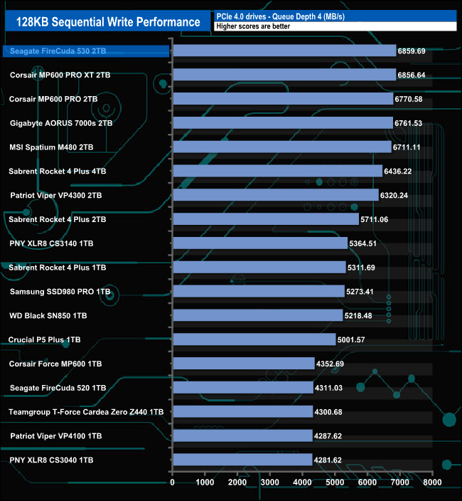 When it comes to Sequential write performance, the FireCuda 530 sits in sixth position in the results chart at QD1, moving up to third at QD2. At both QD4 and QD32, the drive sits on top of the pile. At all the tested queue depths the new drive is much faster than the previous generation FireCuda 520 when it comes to Sequential writes.