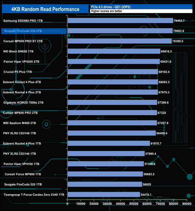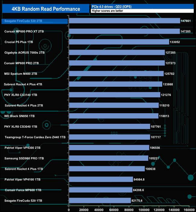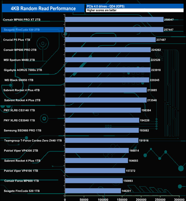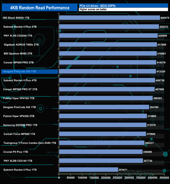 The official maximum 4K random read figure for the 2TB Seagate FireCuda 530 is up to 1,000,000 IOPS. With our 4-threaded testing, we couldn't get close to this maximum figure with a best test result of 414,047 IOPS at a queue depth of 16.