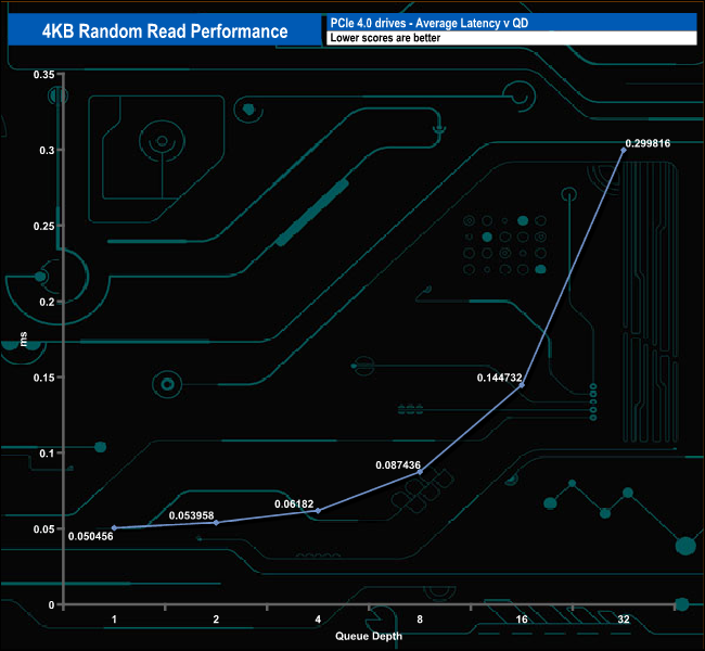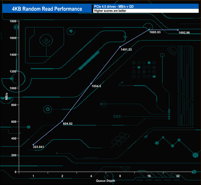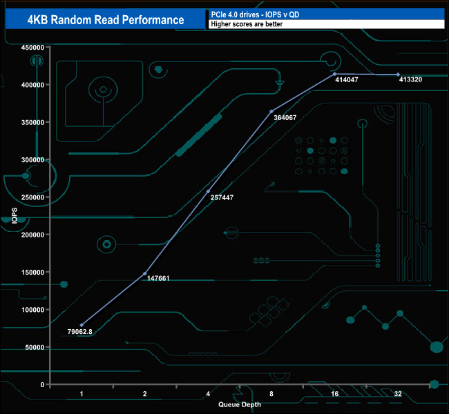 We used CrystalDiskMark 8‘s custom settings to test the 4K random read performance of the drive through a range of queue depths. The setup for the tests is listed below.