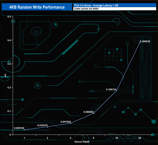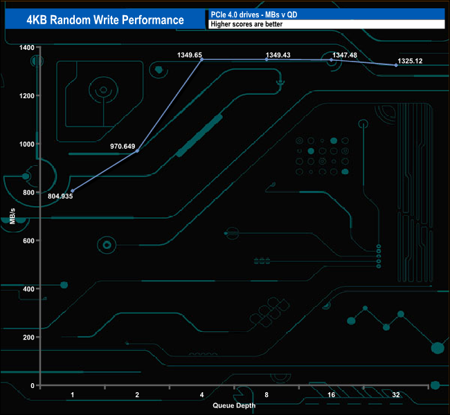 We used CrystalDiskMark 8‘s custom settings to test the 4K random Write performance of the drive through a range of queue depths. The setup for the tests is listed below.