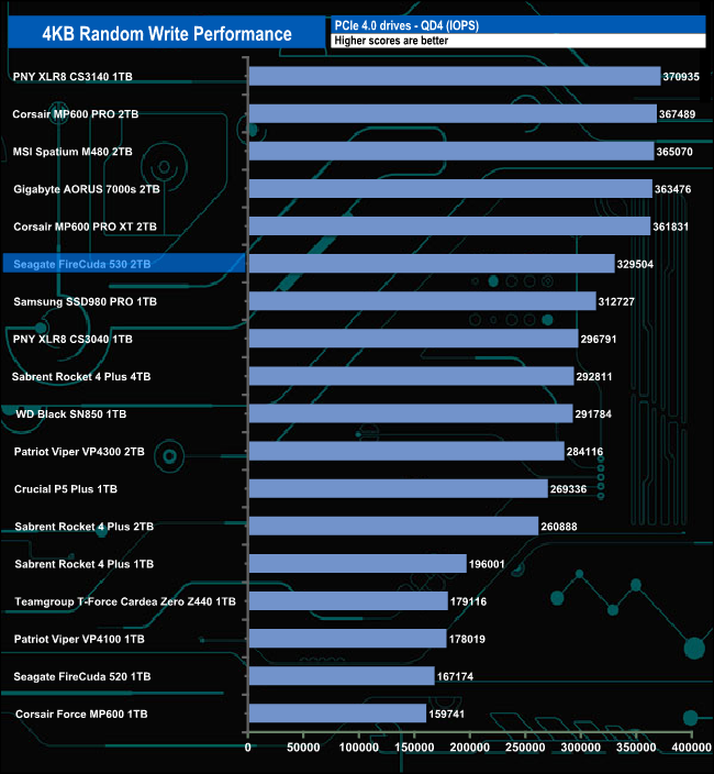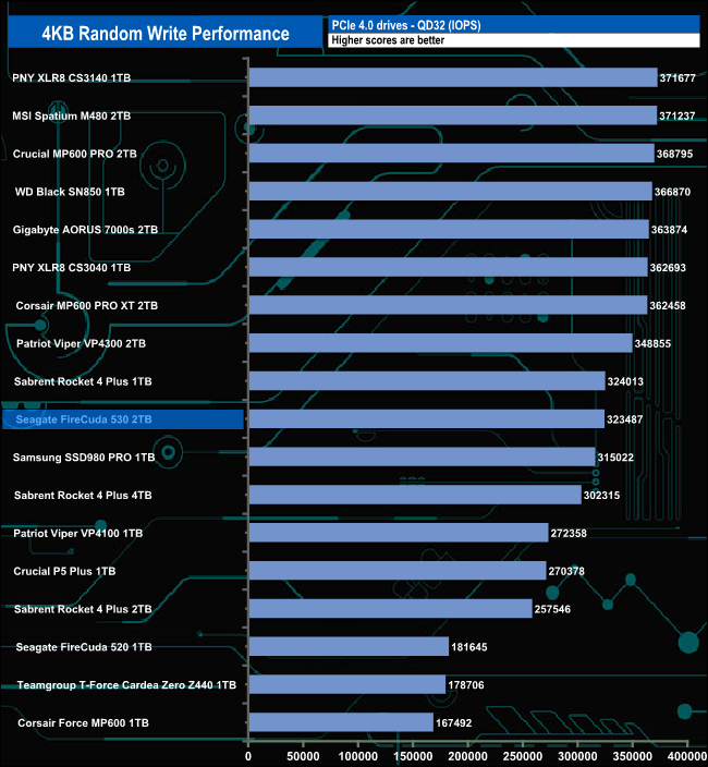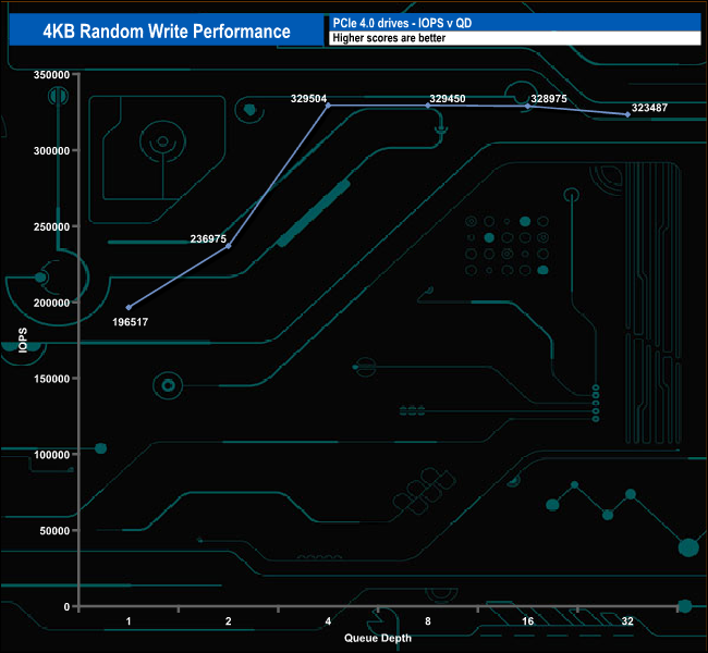 As with 4K random reads, Seagate rates the random write performance of the FireCuda 530 as up to 1,000,000 IOPS. As with the random reads we couldn't get close to this figure with our four-threaded testing with the drive peaking at 329,504 IOPS at QD4.
