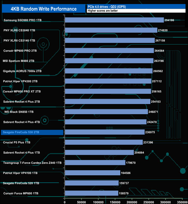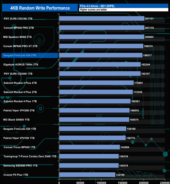 In our testing, the drives best performance in relation to the other drives around it comes at QD1. At all the tested queue depths the FireCuda 530 shows a leap in performance over the previous generation FireCuda 520.