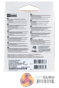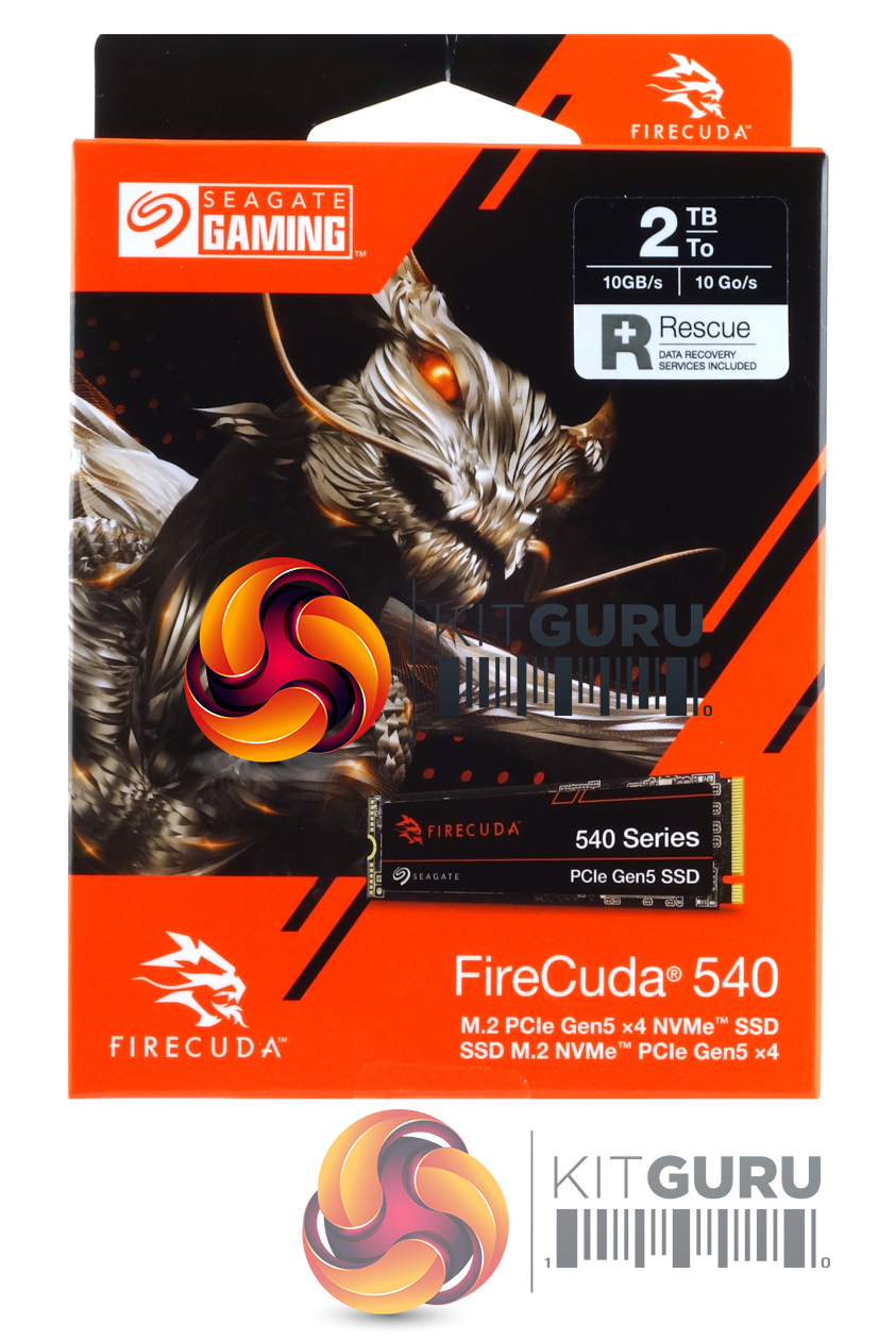 Seagate’s FireCuda 540 comes in a striking orange and white box with Seagate’s FireCuda dragon mascot prominently displayed along with a small image of the drive on the front. At the top of the box is a sticker that displays the drive’s capacity and the Sequential read speed of the drive along with the fact that the drive is supported by Seagate's Data Recovery Service. Towards the bottom of the box is some text displaying the interface of the drive.