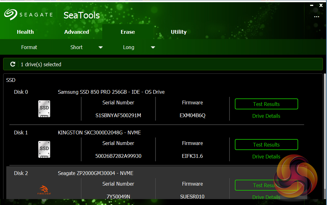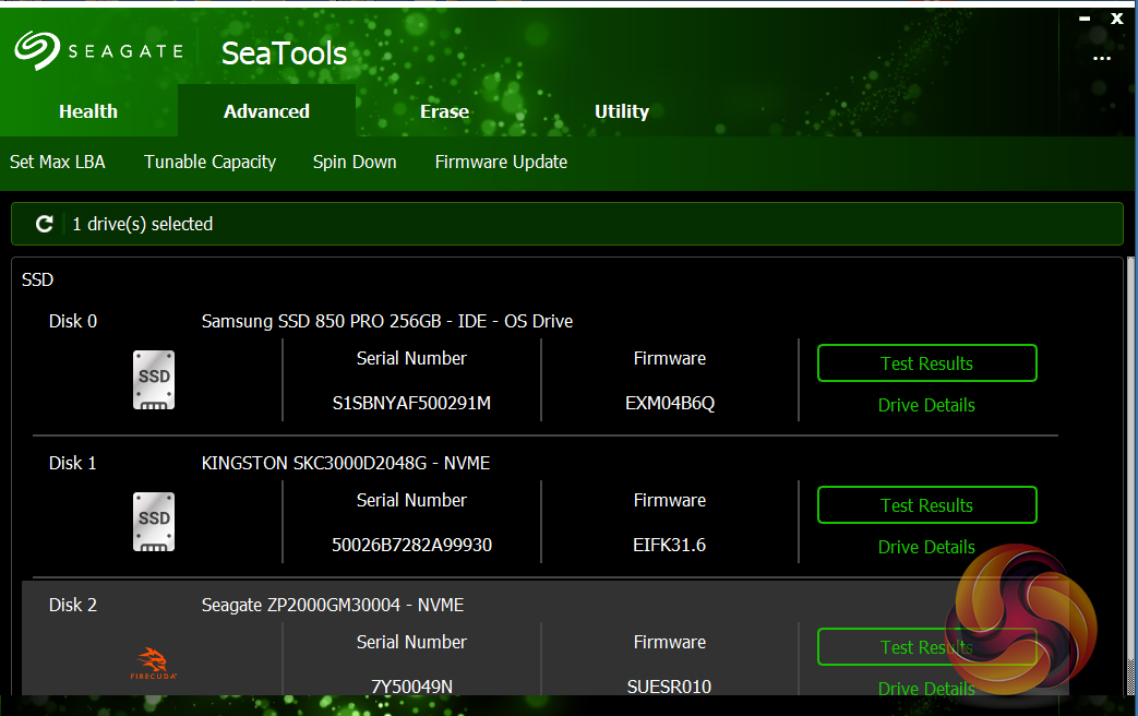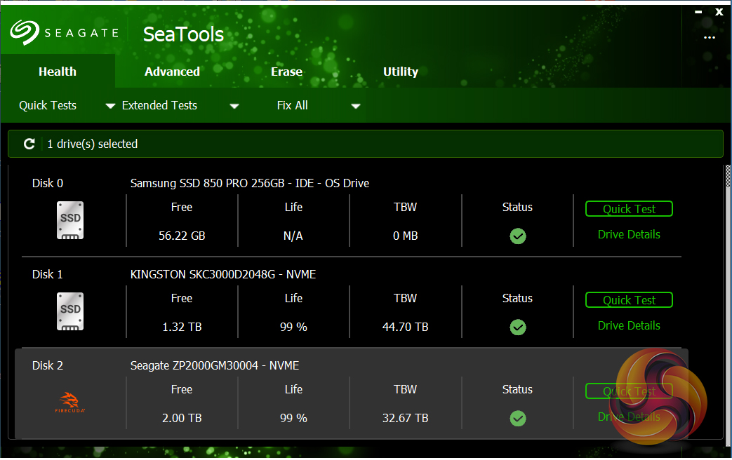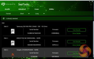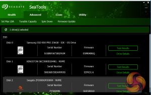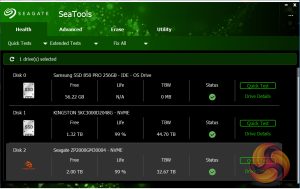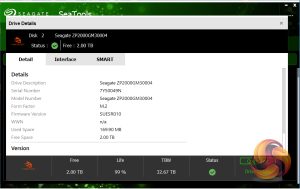 Seagate’s management software for the FireCuda is the SSD version of their SeaTools software. SeaTools SSD displays the drive’s health and supports firmware upgrading and secure erase. Although SeaTools SSD doesn’t come with any drive cloning utility built-in per se it does provide a link to download Seagate’s DiscWizard cloning software. It even gives you a choice of two themes, the standard one or one more suited to the drives gaming role.