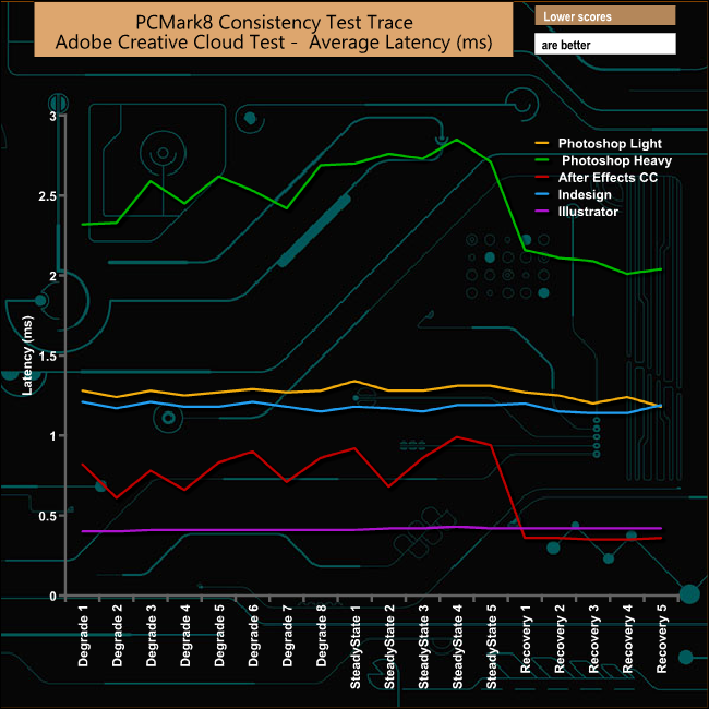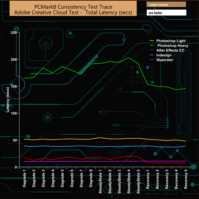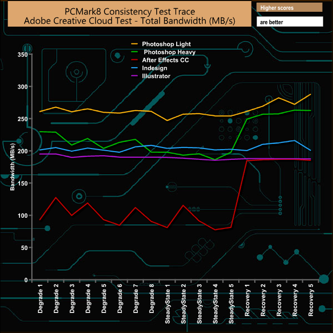 The IronWolf 110 handles the Adobe part of the Consistency test well with no alarming dips in bandwidth in any of the test traces. The most erratic performance comes from the After Effects CC trace but the drive recovers well from the ordeal.