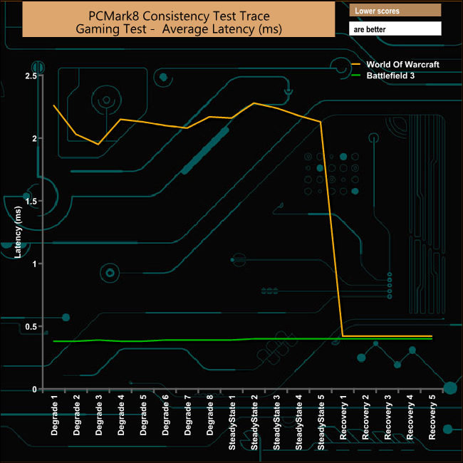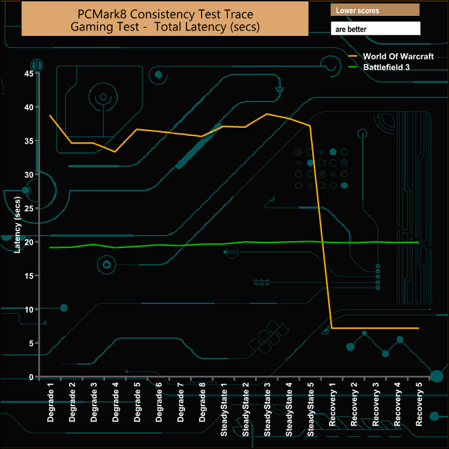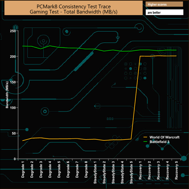 With the casual gaming tests, it's the World Of Warcraft trace that stresses the drive the most. The bandwidth for the Degradation and SteadyState runs is low, averaging just 38MB/s. However, the performance improves dramatically during the Recovery phases.