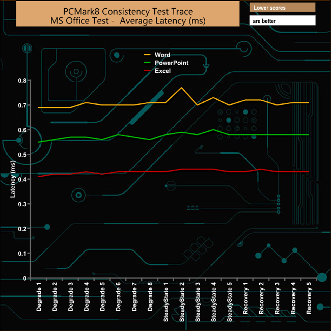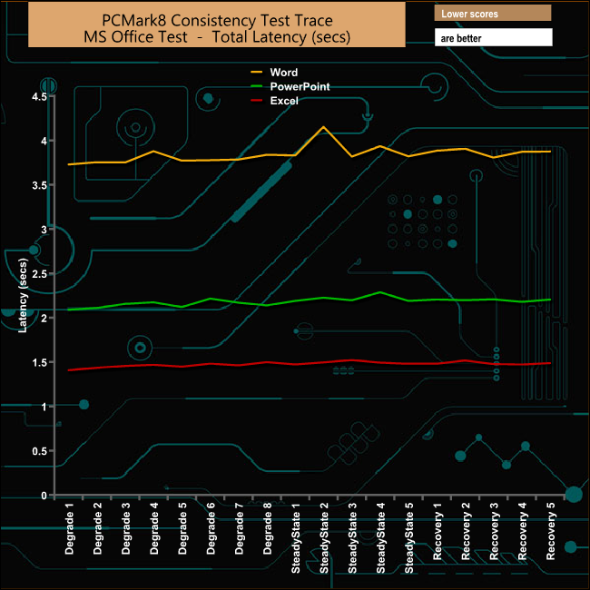PCMark 8’s Consistency test provides a huge amount of performance data, so here we’ve looked a little closer at how the 240GB IronWolf 110 performs in each of the benchmarks test suites.